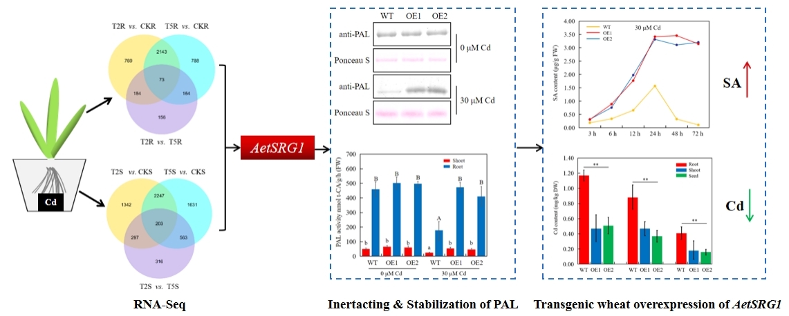 土壤镉污染是影响农作物生长发育及食品安全的有害因素,作物种质创新与利用团队通过转录组测序,挖掘了小麦近缘植物粗山羊草的镉胁迫响应基因。在诸多镉胁迫下的上调基因中,团队关注并深入分析了基因AetSRG1的功能,研究发现,该基因编码一个Fe(II)/ 2-氧代戊二酸加氧酶,其能够通过稳定苯丙氨酸氨裂解酶(PAL)的活性,提高镉胁迫下转基因小麦的内源水杨酸(SA)的含量,进而提高小麦的耐镉能力,同时降低了小麦籽粒的镉含量。