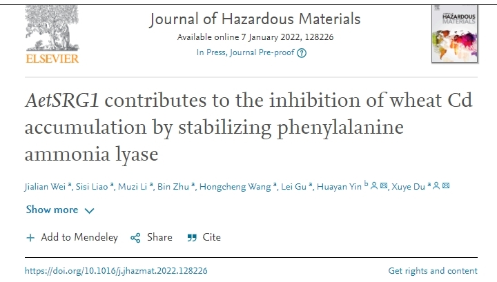 近日,公司作物种质创新与利用团队与青岛农业大学农公司合作在环境科学领域SCI一区Top期刊Journal of Hazardous Materials (IF=10.58)在线发表题为“AetSRG1 contributes to the inhibition of wheat Cd accumulation by stabilizing phenylalanine ammonia lyase”的研究论文。该研究利用转录组学,分析了小麦D染色体组供体粗山羊草的镉胁迫响应基因,并阐明了镉响应基因AetSRG1的功能及其作用机制。