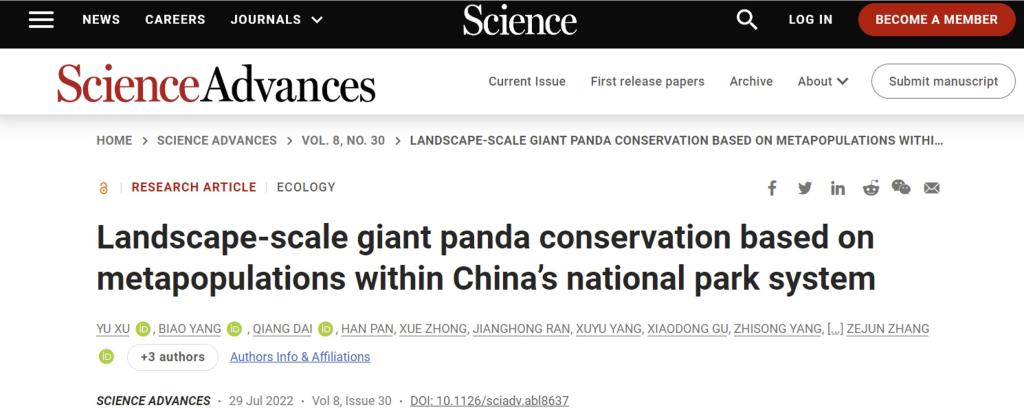 近日,威廉希尔体育徐雨博士以第一作者身份在Science子刊《Science Advances》上发表题为“Landscape-scale giant panda conservation based on metapopulations within China’s national park system”(中国国家公园体系下大熊猫种群的保护)的研究论文。这是公司首次以第一完成单位在世界三大期刊之一的子刊上发表研究论文。