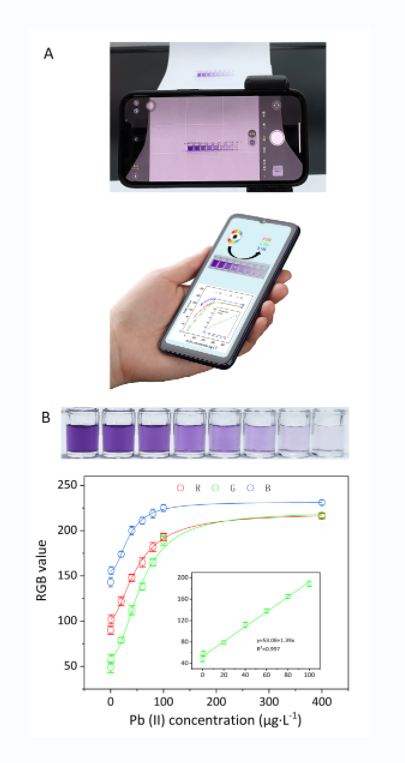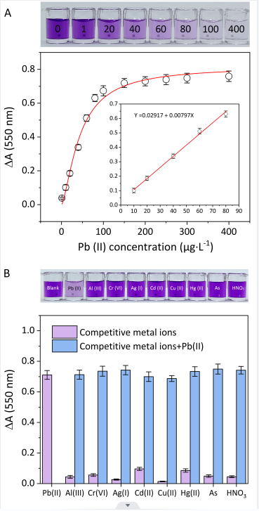 构建的Pb(II)比色传感器检测性能(A.灵敏性;B.特异性)