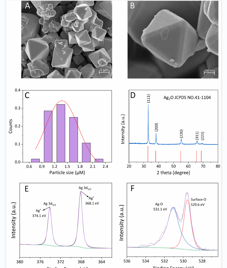 八面体Ag2O的形貌和成分表征 (A-B. FESEM; C.粒径; D. XRD; E-F. XPS)