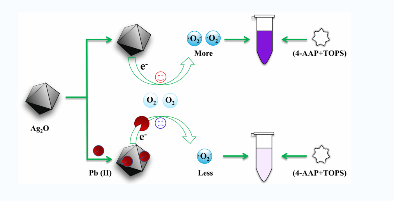 Pb(II)是一种广泛存在的重金属离子,被列为2B级致癌物。人体摄入过量的Pb(II)会损害中枢神经系统、肾脏、肝脏和免疫系统,导致永久性脑损伤、贫血和癌症。本研究发现Pb(II)可抑制八面体氧化银 (Ag2O)的类氧化酶活性,开发了一种用于检测Pb(II)的智能手机辅助分析比色传感器。