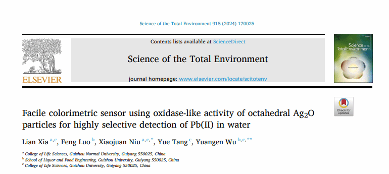 近日,公司牛晓娟老师与贵州大学合作,在生态环境领域1区Top期刊Science of The Total Environment(IF = 9.8)上发表了题为“Facile colorimetric sensor using oxidase-like activity of octahedral Ag2O particles for highly selective detection of Pb(II) in water”的研究论文。