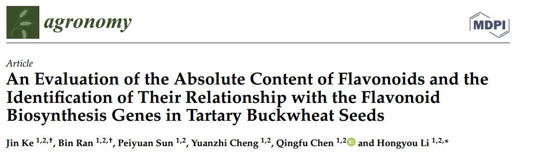 评价苦荞种子中黄酮类成分的绝对含量和积累模式,了解黄酮类成分之间的积累关系,探讨苦荞种子中类黄酮成分含量与类黄酮生物合成基因表达的相关性,构建苦荞种子中主要类黄酮成分的生物合成途径,可以为苦荞种子中类黄酮成分及其生物合成的研究提供充足的理论依据,并在培育高类黄酮含量新品种方面具有潜在的应用前景。2023年12月7日,威廉希尔体育/贵州省荞麦工程技术研究中心,柯瑾等在Agronomy(中科院2区,IF=3.7)发表题为“An Evaluation of the Absolute Content of Flavonoids and the Identification of Their Relationship with the Flavonoid Biosynthesis Genes in Tartary Buckwheat Seeds”的研究论文。