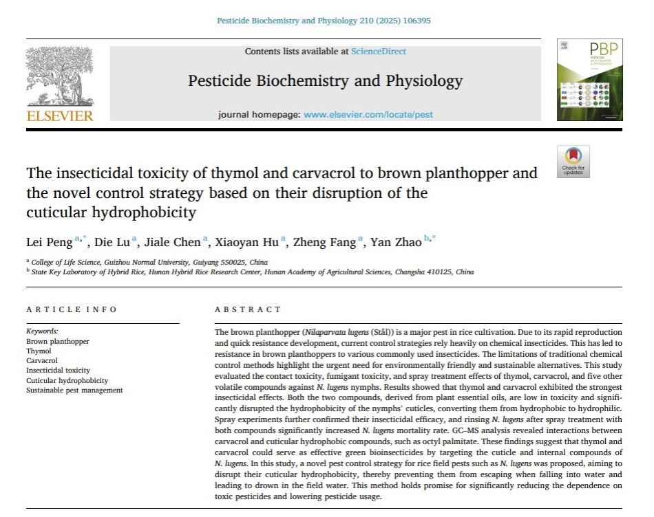 近日,公司高级实验师彭雷博士与湖南省农业科公司杂交水稻研究中心、杂交水稻国家重点实验室合作,在国际知名的农学一区TOP期刊Pesticide Biochemistry and Physiology(IF:4.2)上发表了题为“The insecticidal toxicity of thymol and carvacrol to brown planthopper and the novel control strategy based on their disruption of the cuticular hydrophobicity”的研究论文。