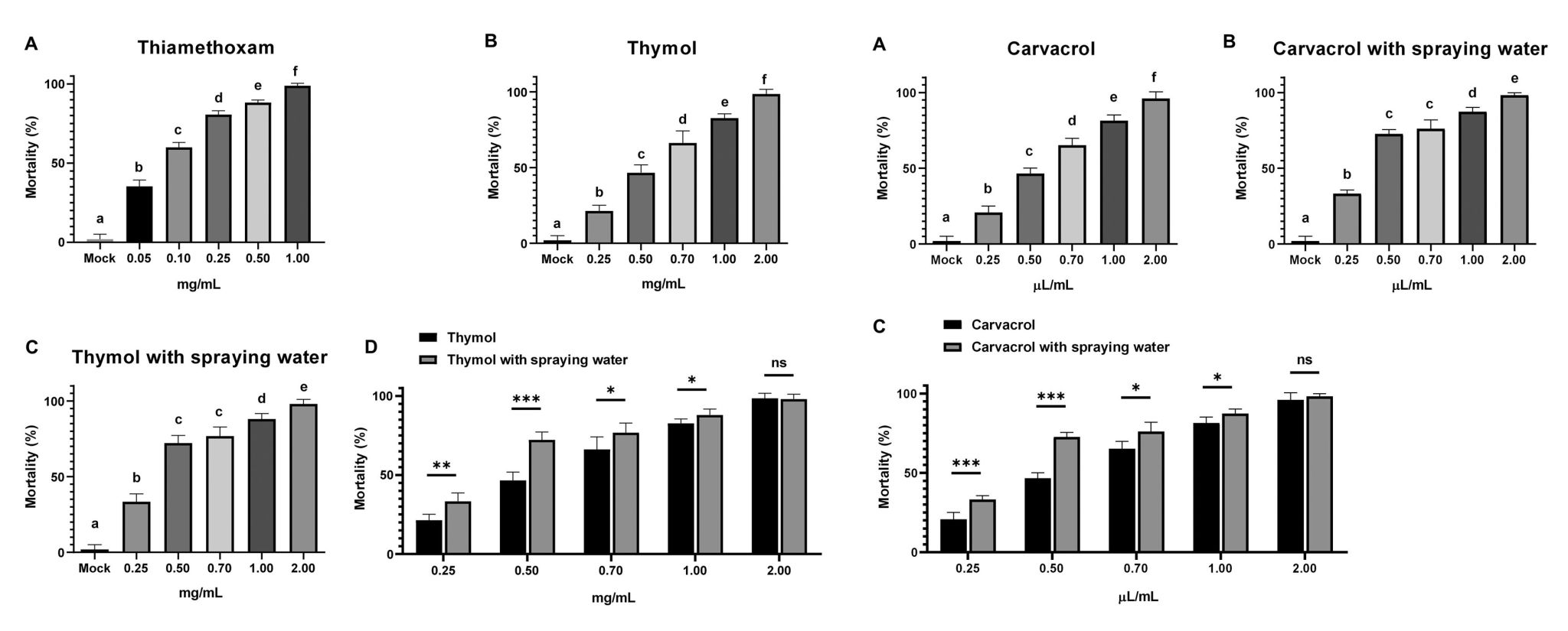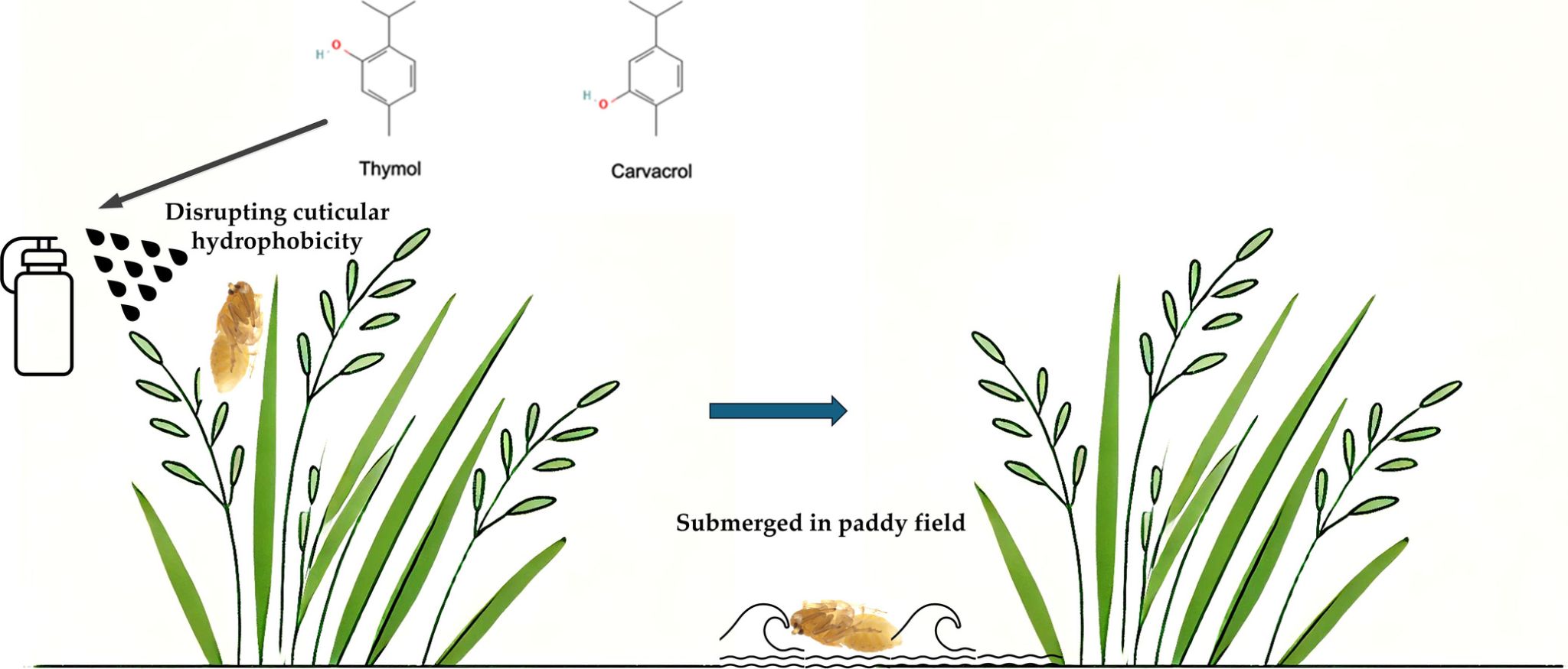 该研究系统评估了百里香酚(thymol)、香荆芥酚(carvacrol)及其他五种天然挥发性化合物对褐飞虱若虫的接触毒性、熏蒸毒性和喷雾处理效果。结果表明,百里香酚和香荆芥酚表现出最强的杀虫活性。这两种单萜酚类化合物广泛存在于百里香和牛至精油中,不仅毒性低、对非靶标生物安全,而且能显著破坏褐飞虱体表的疏水性,使原本疏水的表皮转变为亲水状态,降低其在水田环境中的生存能力。喷雾实验进一步验证了百里香酚和香荆芥酚的显著杀虫效果,特别是在喷雾处理后进行浇水使褐飞虱掉落在土里后,褐飞虱的死亡率明显上升。GC–MS揭示,香荆芥酚可与体表疏水性物质如十六酸辛酯等发生相互作用,从而破坏其保护性蜡质层。