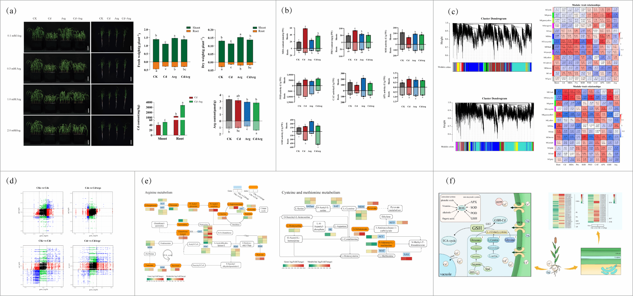 通过整合生理、转录及代谢组学发现,外源Arg可以通过提高高梁内部相关抗氧化物酶含量的上升来清除植物中过量的活性氧。同时根部苯丙烷生物合成和细胞壁多糖合成相关基因表达和代谢物含量上升,导致细胞壁的重构,将镉固定在根部细胞壁中,降低镉由根部向内的转运,增强镉的吸收和积累。随后,研究还发现高梁体内通过相关途径合成大量GSH和镉螯合,减少高梁体内游离的镉离子,部分镉还会通过液泡膜上的重金属转运蛋白将其转运到液泡中隔离。研究揭示了外源Arg缓解高梁镉胁迫的生理和分子机制,为促进植物修复策略和作物生产提供了新的见解。