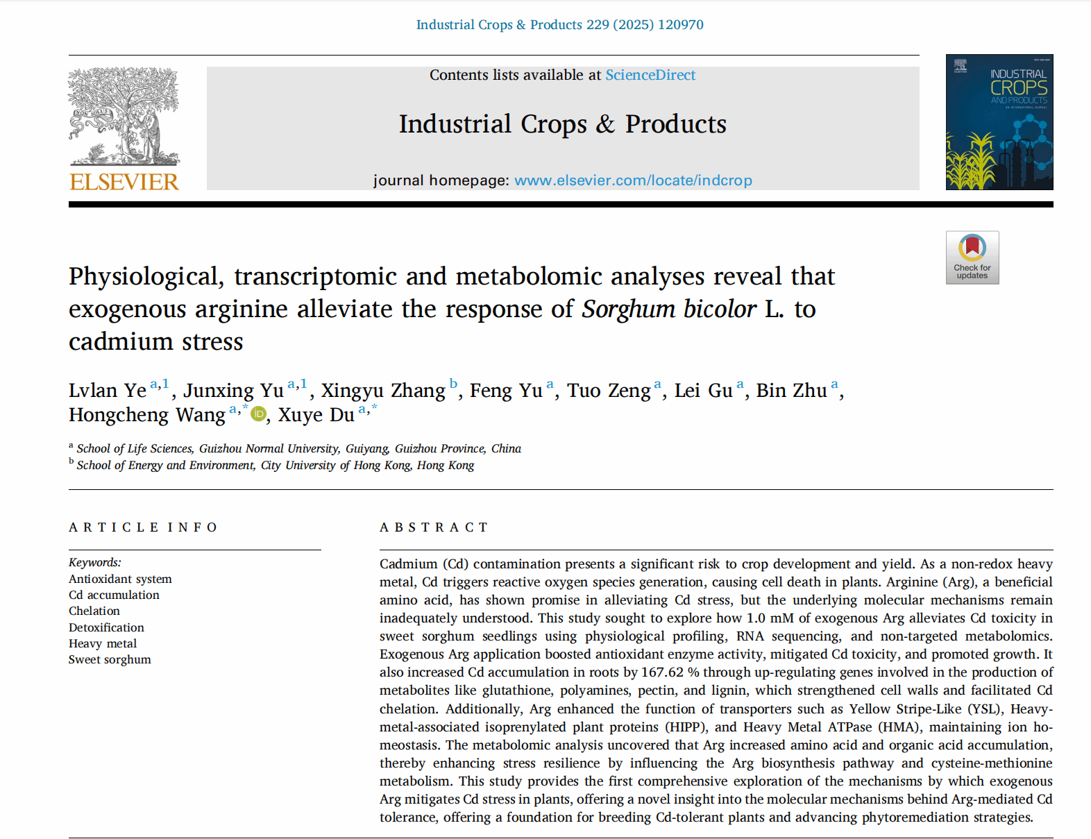 公司贵州省作物抗逆分子生物学科技创新团队王洪程课题组在中科院一区TOP期刊Industrial Crops and Products(IF=5.6)发表题为“Physiological, transcriptomic and metabolomic analyses reveal that exogenous arginine alleviate the response of Sorghum bicolor L. to cadmium stress”的研究论文,揭示了添加外源精氨酸(Arg)缓解高梁镉胁迫的分子机制。