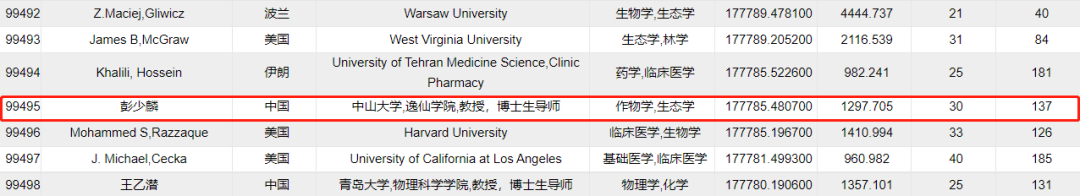 中国生态学领域仅67人上榜,其中就包括公司彭少麟教授,学科为作物学,参考学科为生态学。
