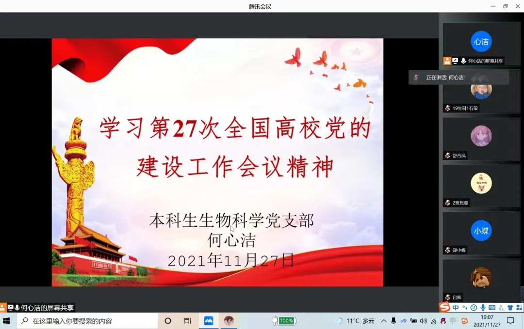 11月19日至29日,威廉希尔体育教职工生党支部分别于线上、线上召开会议,专题学习传达第二十七次全国高公司党的建设工作会议精神,以深入学习领会会议精神,增强院系党组织的政治功能,加强师生党支部建设,切实推动公司党建取得新成效、迈上新台阶。