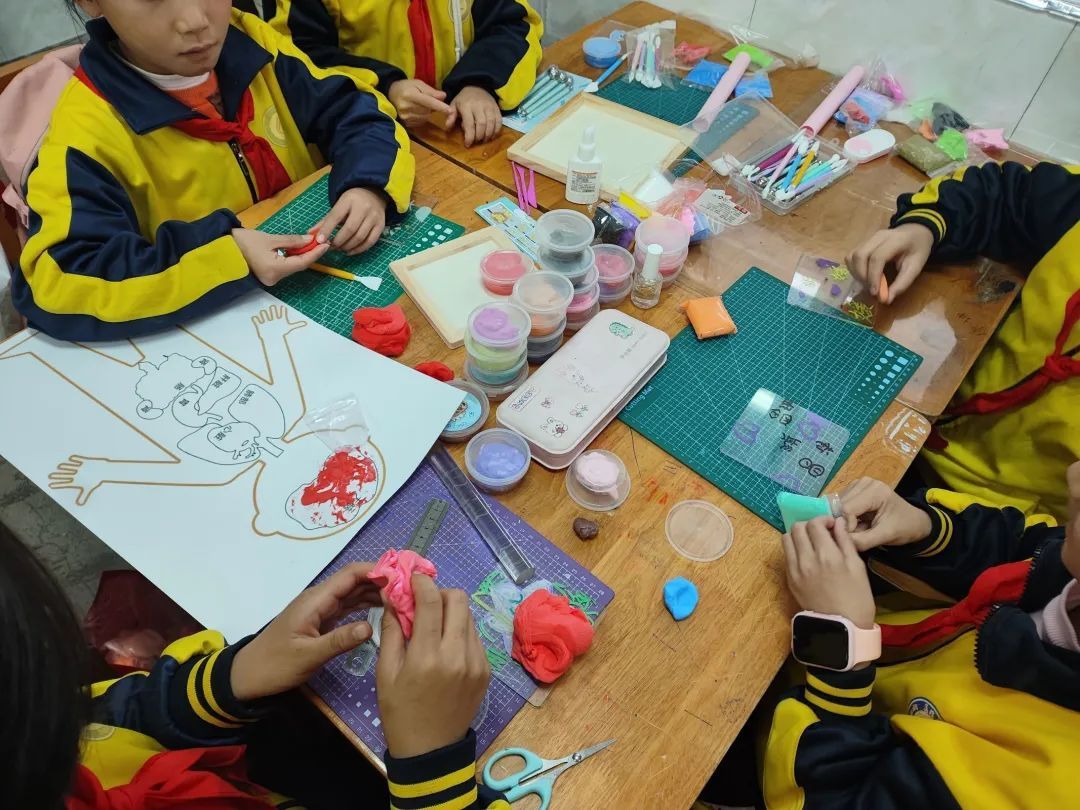 接下来是别开生面的手工环节——人体器官模型的制作。小朋友们在志愿者的帮助下,结合上节课的知识讲解和发放的人体结构示意图,用黏土完成人体器官模型的制作。开始的指令一发出,小朋友们就迫不及待地将五颜六色的黏土揉捏成各种器官的形状,并将其按照图纸提示,摆放到正确位置上。