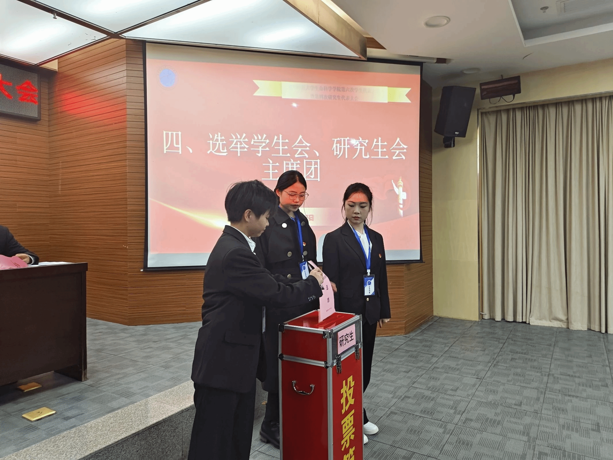 最后,通过民主选举,周秘密、潘佳佳两位同学当选为威廉希尔体育第六届员工会主席团成员;张豪申、罗海霞两位同学当选为威廉希尔体育第四届研究生会主席团成员。