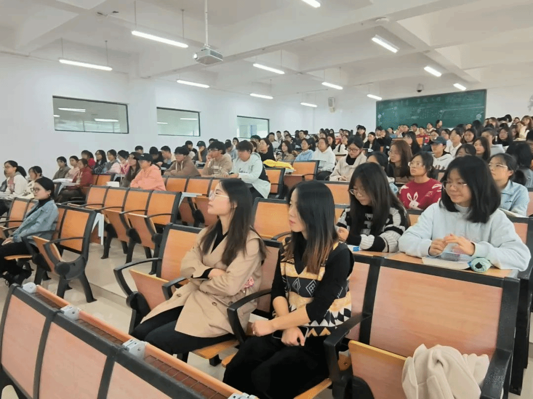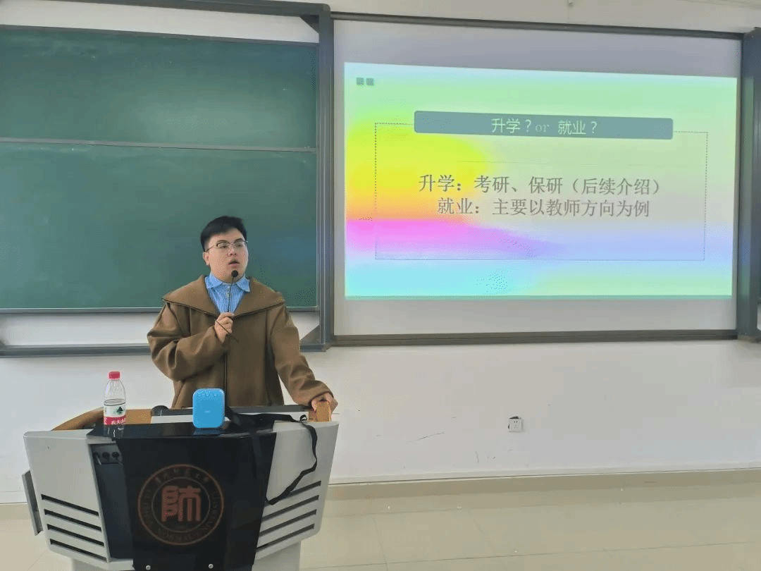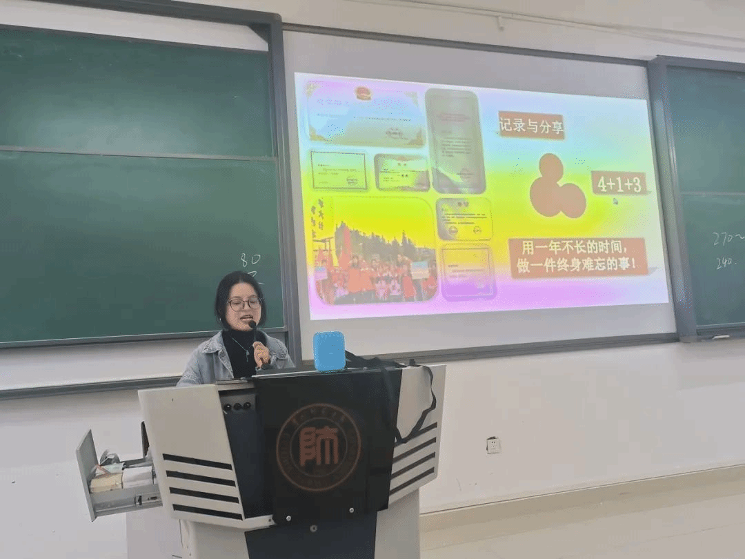 研究生支教团蔡明飞同学向大家分享了她为期一年的研究生支教团经历所带来的收获与成长,强调在合适的时机抓住难得的机会,勇敢逐梦“用短暂的时间去做一件一生难忘的事情”,并鼓励大家学习专业课要把功夫放在平时,在生活中要平衡好交友与心态的关系。