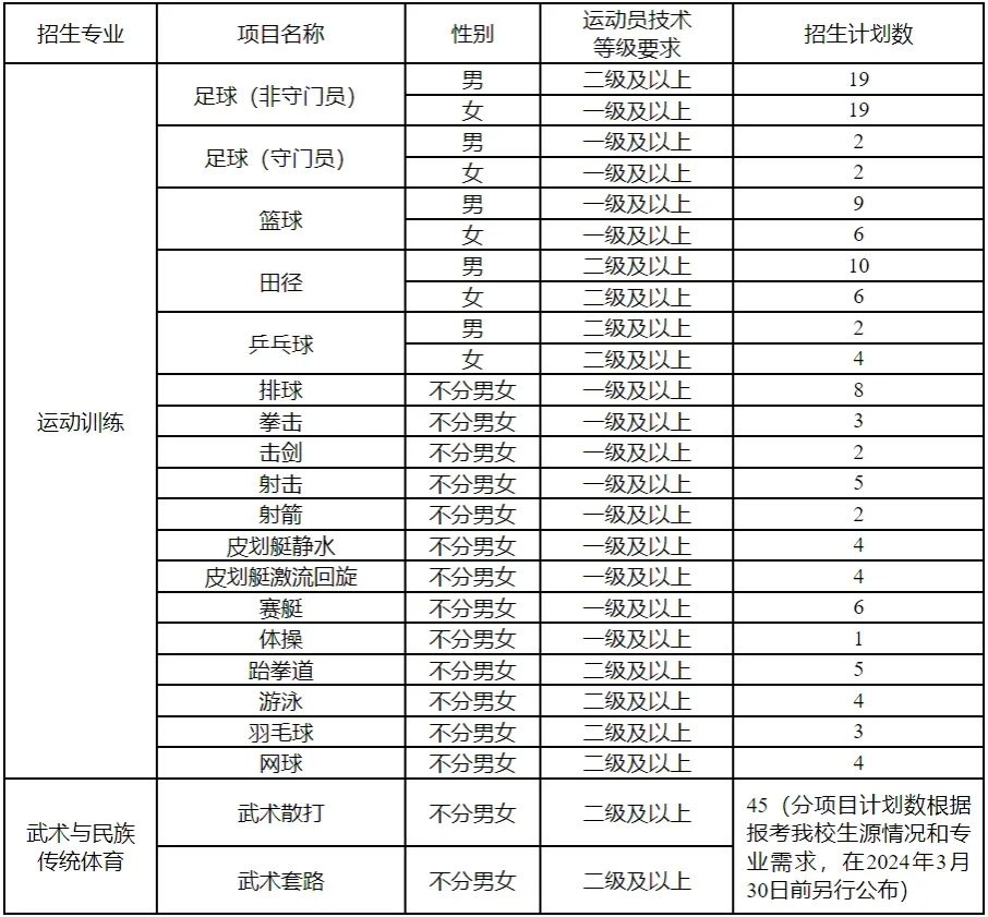 2024年招生总计划175人,其中运动训练专业130人,武术与民族传统体育专业45人,具体各项目招生计划数见下表。
