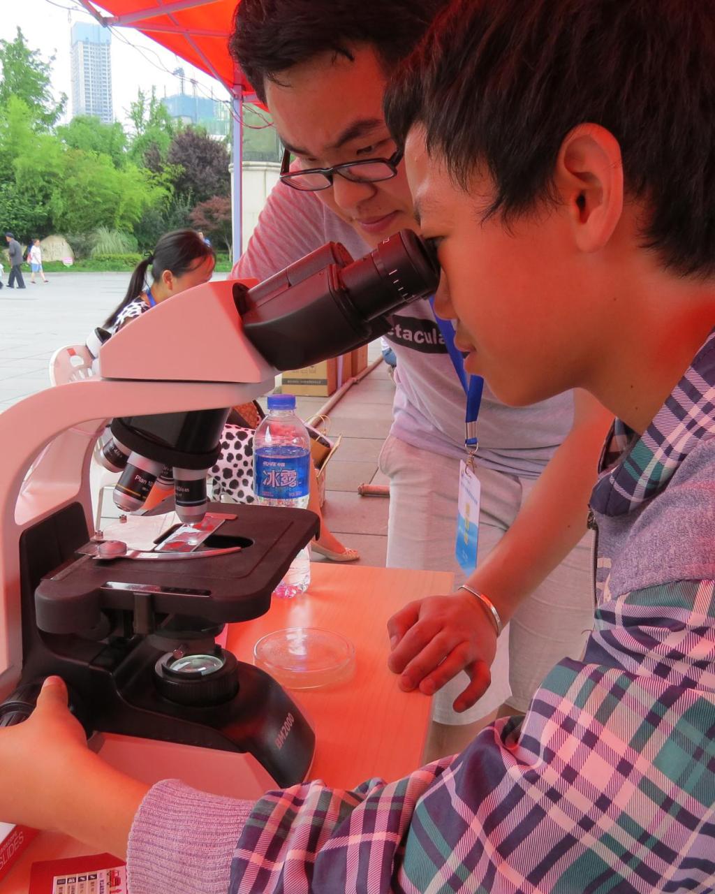 生科院的本科生及研究生担任了此次活动的志愿者,他们在公司专业教师的指导下,现场演示并协助观众体验显微镜的使用,观察大肠杆菌、酵母菌、霉菌等常见却又不容易“看到”的有趣微生物。带着孩子来参观的家长们,纷纷带小朋友体验微生物形态科普徽章DIY,按照事先准备好的图案填好颜色、标注好各部分的名称,就可以免费制作为一枚独一无二的纪念徽章了。许多中年老观众则对有奖答题兴趣浓厚,通过在展板上寻找毒蘑菇鉴别和贵州食用菌产业扶贫的相关知识点答题,就可以获得由贵州果蔬行业协会组织的食用菌礼品,不但吃得放心,还增长了知识。