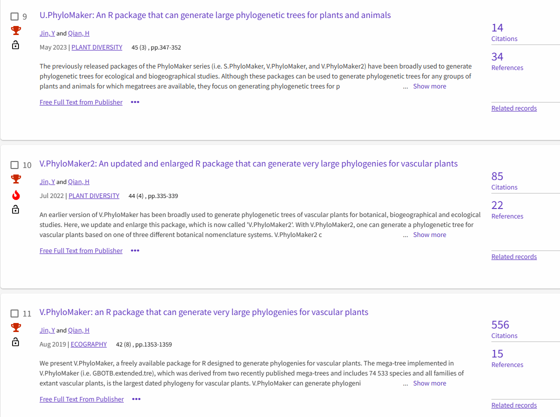 早在2015年,在进化树构建研究方向上,金毅与合作者就开发了第一个R语言软件包,命名为S.PhyloMaker。进入公司后,又陆续开发了V.PhyloMaker(2019年,ESI高被引论文,基于2024年第2期数据,下同)和V.PhyloMaker2(2022年,ESI高被引论文和热点论文),以及最新开发的用于生成所有动植物主要类群进化树的U.PhyloMaker(2023年,ESI高被引论文)。截至目前,该系列软件包累积被引用次数近1000次(据Web of Science),获得了国内外同行的广泛使用和认可,为该研究方向的发展作出了重要贡献。同时,以上系列高水平论文的发表对于提升公司的国际声誉、扩大学科影响力具有重要意义。