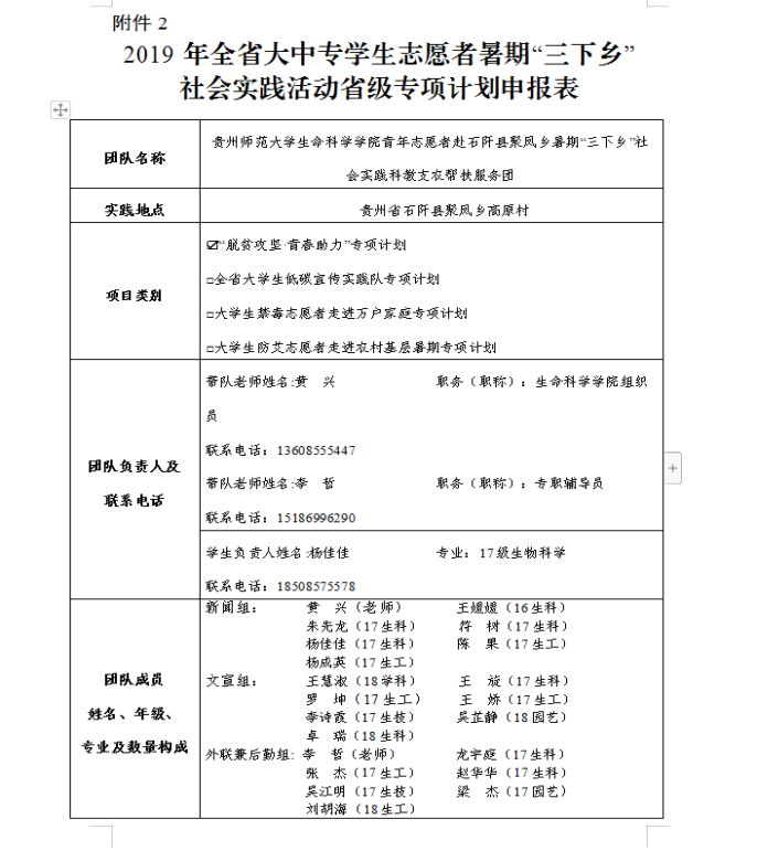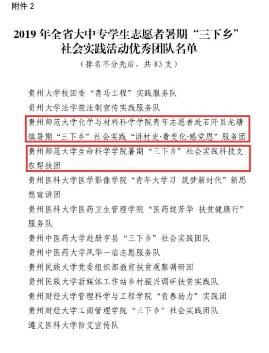 近日,贵州省委宣传部、贵州省文明办、贵州省教育厅、团省委以及贵州省员工联合会联合公布了关于2019年全省大中专员工志愿者暑期“三下乡”社会实践活动的通报结果,公司暑期“三下乡”社会实践科技支农帮扶团被评为“2019年全省大中专员工志愿者暑期‘三下乡’社会实践活动优秀团队”。