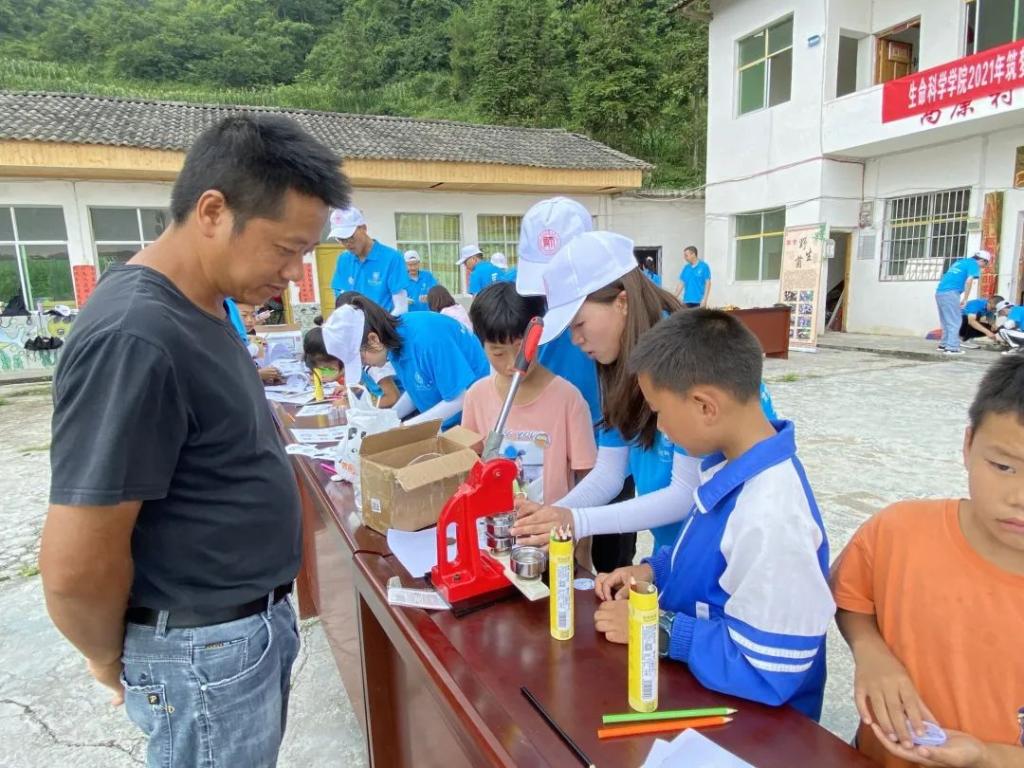 为构建人与自然和谐共处的美好画卷,“三下乡”队员们开展DIY徽章制作。小朋友们可以选择自己喜欢的小动物图案,涂上亮丽的颜色,体验亲手制作徽章的过程。在制作过程中,志愿者们也向小朋友们宣传保护野生动植物、爱护家园的理念。