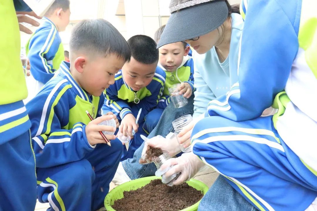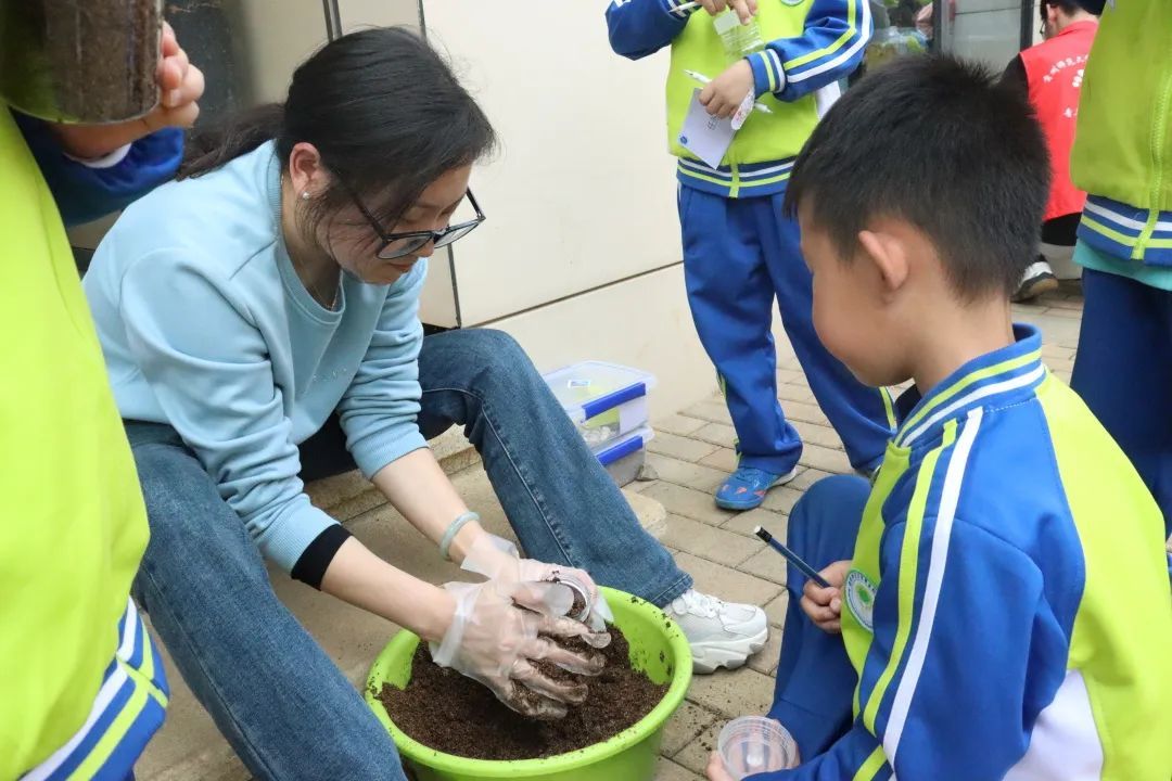 然后,由公司老员工志愿者带领各班级小组的同学进行寻找营养土、蛭石、种植瓶等“宝藏”,便自主选择开始了种植,如:扦插刺梨枝条、多肉叶片、大蒜鳞茎,以及播撒彩色辣椒和迷你小西瓜种子等,香樟农场里洋溢着劳动的欢声笑语......