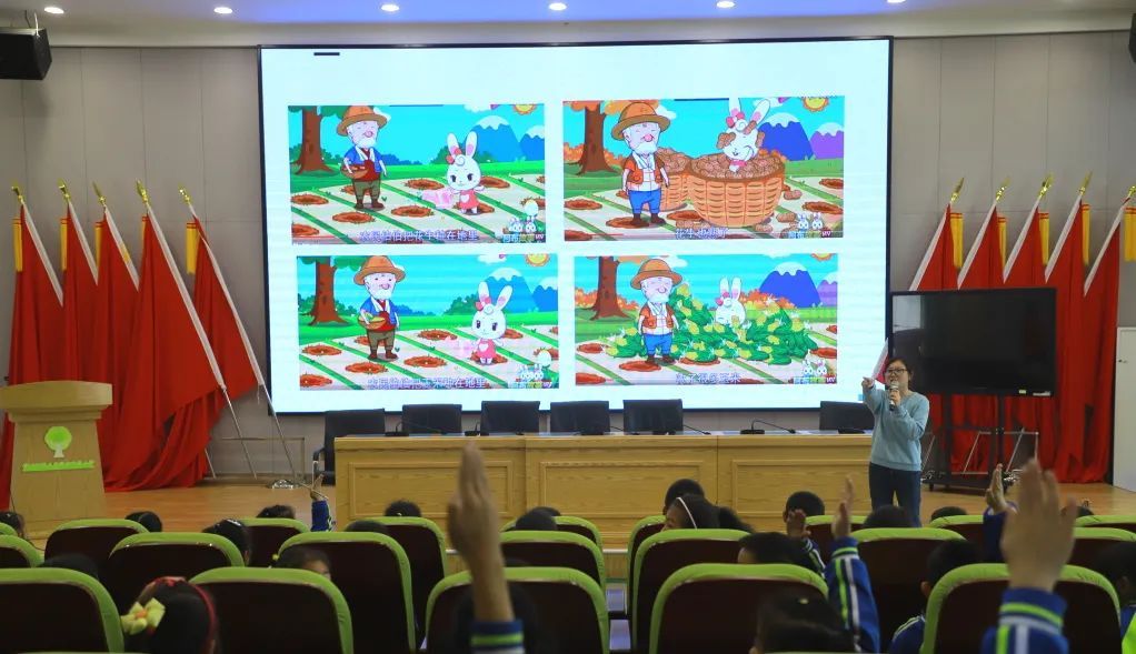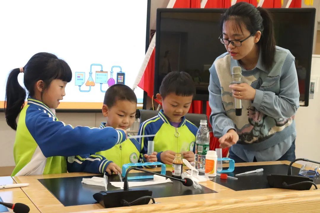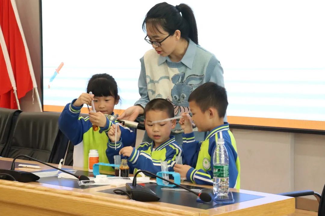 活动伊始,由附小德育主任龚睿老师介绍本次活动的主要议程,接着于晓翠老师以科普小实验作为热场活动,讲解和演示了生活中常备杀菌消毒剂碘伏的用途和功效,以及维生素C的作用,随后邀请一年级同学进行实验操作,探究“碘伏溶液中加入维生素C后发生的变化”。同学们都专注地观察着实验过程中发生的奇妙变化,在于老师启发式的讲解下明白了“维生素C能将碘伏溶液中的碘单质还原为碘离子,使其由深棕色变为无色透明溶液的化学现象”,也借助这个原理提醒同学们提高自我保护的安全意识。