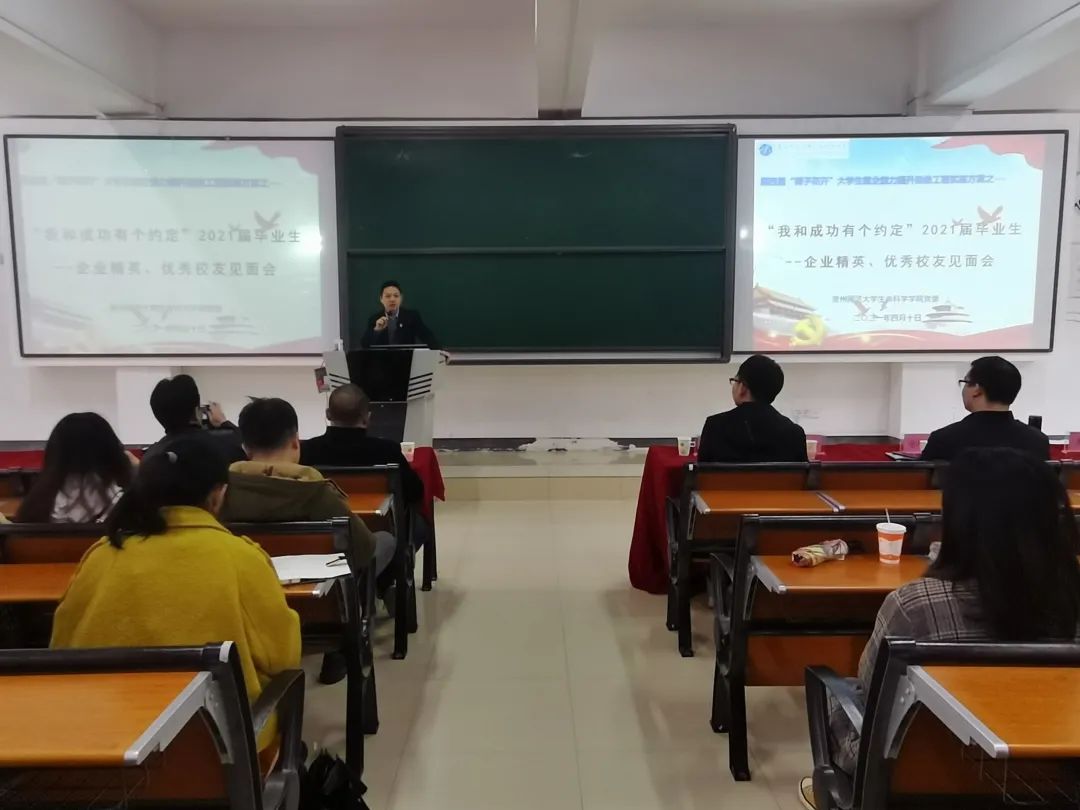 本次见面会邀请到双创导师、贵州牛芭啦企业(集团)董事长、中华博士联合会贵阳工作站执行秘书长、贵州大学客座教授马业君,贵州陌尚文化传媒有限公司董事长、贵州省电动车商会常务副会长、贵州大学现代乡村振兴研究院筹建组专家路旭,贵州泛特尔细胞生物技术有限公司副总经理、贵州民族大学特聘专家张凤宁,贵州中医药大学副教授、中国法学会会员、中华全国律师协会会员、执业律师崔超博士,贵州医科大学副教授、博士研究生导师、贵州师大生科院员工彭建博士,贵州医科大学副教授、贵州师大生科院员工王璐博士等企业精英、优秀员工带来满满干货,分别为毕业生作了精彩讲座,分享了他们学习成长、求职经验、人生奋斗历程,鼓励毕业生们沉下心思,学以致用,服务基层,一步一个脚印,先就业后择业,先图生存再谋发展,并现场为大家解惑答疑。