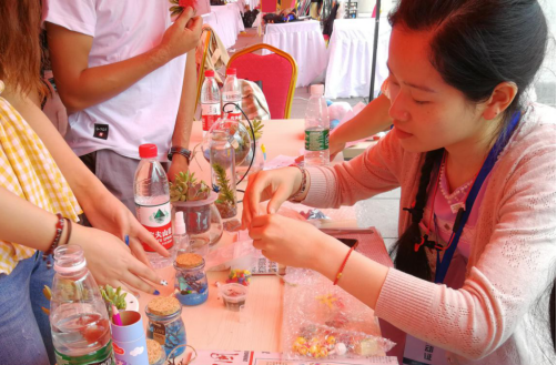 由生科院青分会和员工社团博物学社招募的本科生、研究生担任了此次活动的志愿者,他们现场演示了生态瓶和叶脉书签的制作,协助观众制作完成精美的叶脉书签。山地动植物卡通形象的科普徽章DIY,吸引了很多观众;许多中年老观众则对有奖答题兴趣浓厚,通过在科普展板上学习生态系统、洞穴生态系统、高山杜鹃种质资源保护研究等相关知识点并完成答题,就可以获得迷你生态瓶、野生动物毛绒玩具、植物种子和科普明信片等特色纪念品,不但富于趣味,还增长了知识。