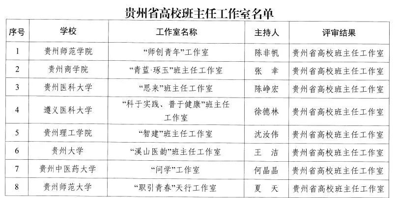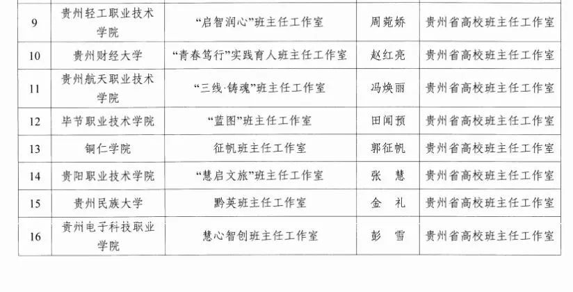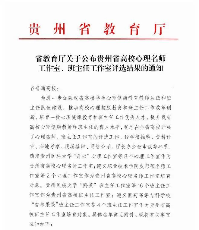 近日,中共贵州省委教育工委、贵州省教育厅正式发文公布贵州省高校心理名师工作室、班主任工作室评选结果。经公司推荐、资料评审、实地考察、现场答辩、网络公示、厅长办公会审议等环节,公司“职引青春”天行工作室获批第一批贵州省高校班主任工作室,全省仅16家单位入选。