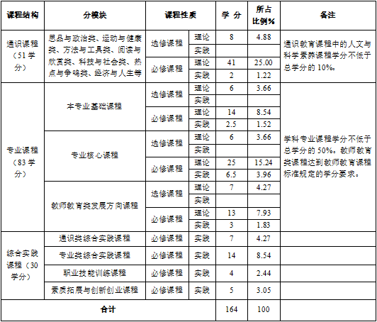参考总学时或学分:毕业所需总学分为:164学分;其中,通识课程51学分;专业课程83学分;综合实践课程30学分;必修课程137学分;选修课程27学分;毕业论文(设计)6学分。