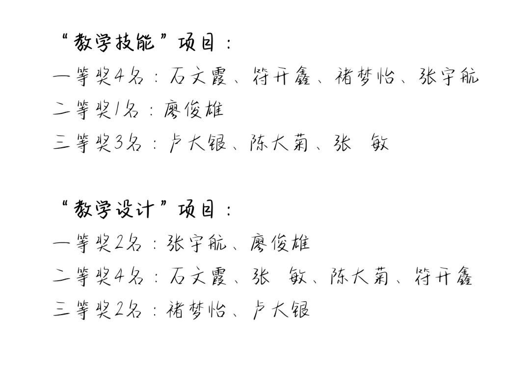 张宇航同学:从教学设计、教学思路、PPT设计、板书设计的不断更改和授课语言的不断调整,到最后赛场上的最终表现,在此过程中离不开老师们的指导和同伴们的帮助!熬夜修改、通天练课已是备赛过程中的常态。当比赛抽签抽到下午场第一位出场时,更多的是担忧和慌乱……此次比赛令我收获颇丰,但也充分意识到自己与他人的差距,今后仍要投入更多时间与精力钻研教学教法。